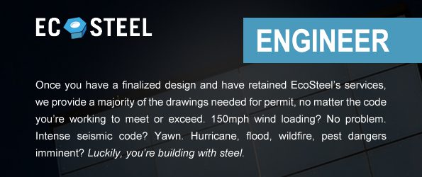Once Ecosteel and your Architect have agreed on a final design and framing layout, we finalize our structural drawings. We provide the the structural engineering stamp needed for permit along with a few high resolution exterior renderings to assist with city design approval. Our buildings are designed to meet or exceed local code while resisting earthquakes, hurricanes, floods, and wildfires.