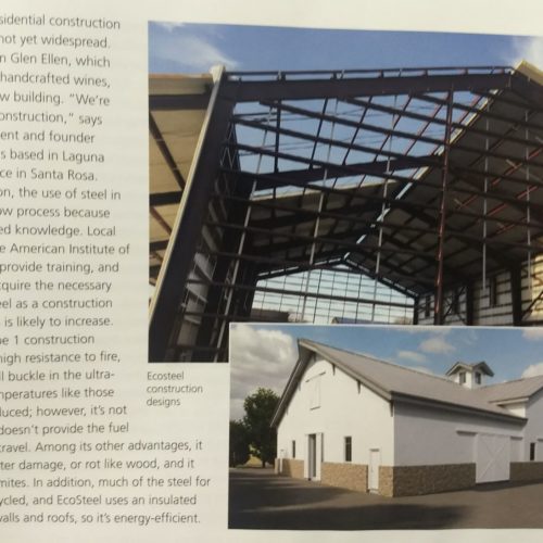 Another alternative to wood is steel, though its use in residential construction in the North Bay is not yet widespread. Wellington Cellars in Glen Ellen, which produces small-lot, handcrafted wines, used steel for its new building. “We’re seeing more steel construction,” says Joss Hudson, president and founder of EcoSteel, which is based in Laguna Niguel, Calif. and has an office in Santa Rosa. According to Hudson, the use of steel in construction is a slow process because it requires specialized knowledge. Local steel unions and the American Institute of Steel Construction provide training, and as more workers acquire the necessary skills, the use of steel as a construction material for houses is likely to increase.