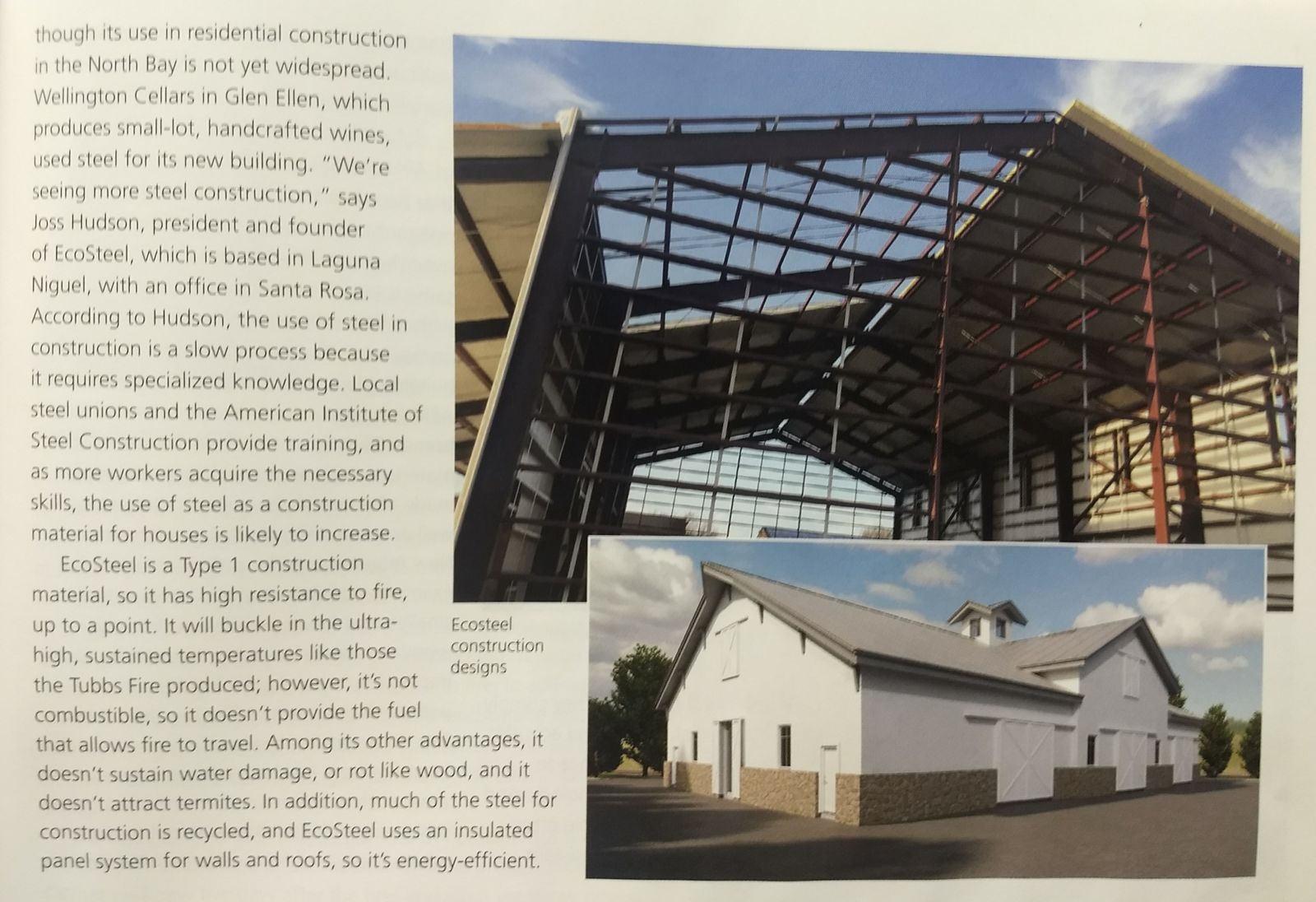 EcoSteel is a Type 1 construction material, so it has high resistance to fire, up to a point. It will buckle in the ultra-high, sustained temperatures like those the Tubbs Fire produced; however, it’s not combustible, so it doesn’t provide the fuel that allows fire to travel. Among its other advantages, it doesn’t sustain water damage or rot like wood, and it doesn’t attract termites. In addition, much of the steel for construction is recycled, and EcoSteel uses an insulated panel system for walls and roofs, so it’s energy-efficient.