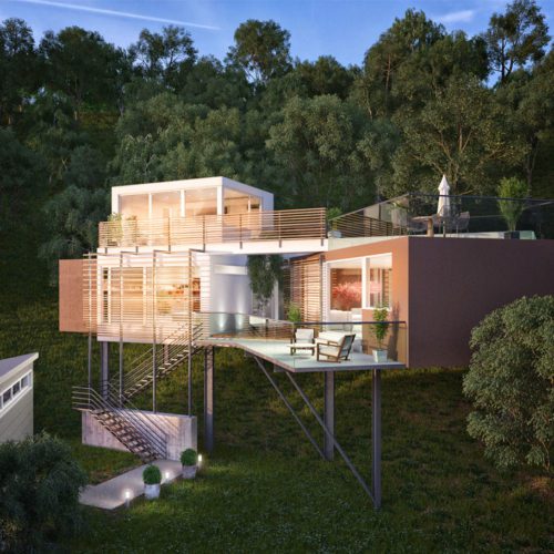 This EcoSteel Prefab Designed home sits in the heart of Bel Air, one of L.A.’s most exclusive neighborhoods with a view of the Getty Museum. Details 1,250 SF 3 Bed / 2 Bath house 400sf Garage Laundry Loft office…