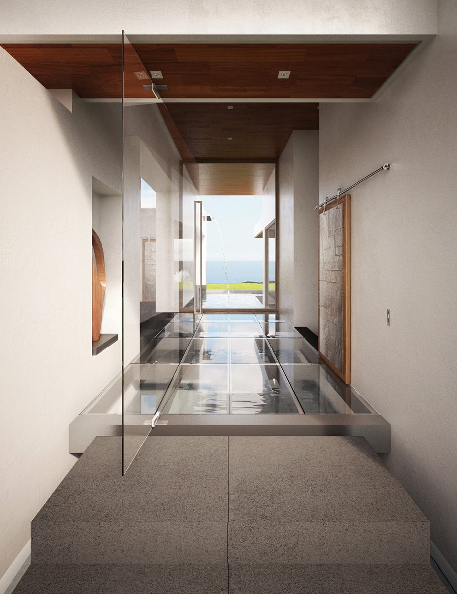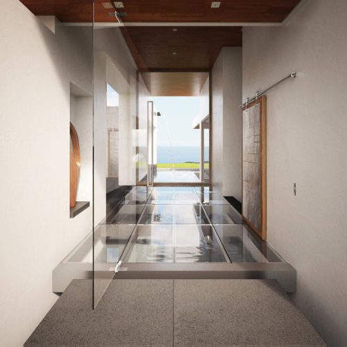 - reflecting pool entry walkway, glass bridge over reflecting pool at entry foyer, glass staircase