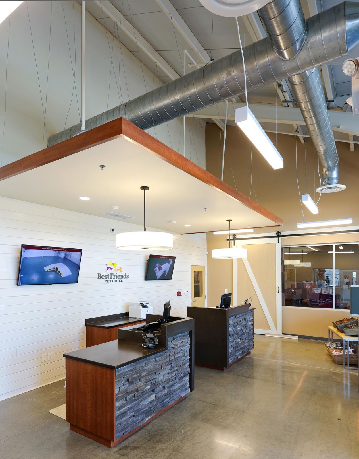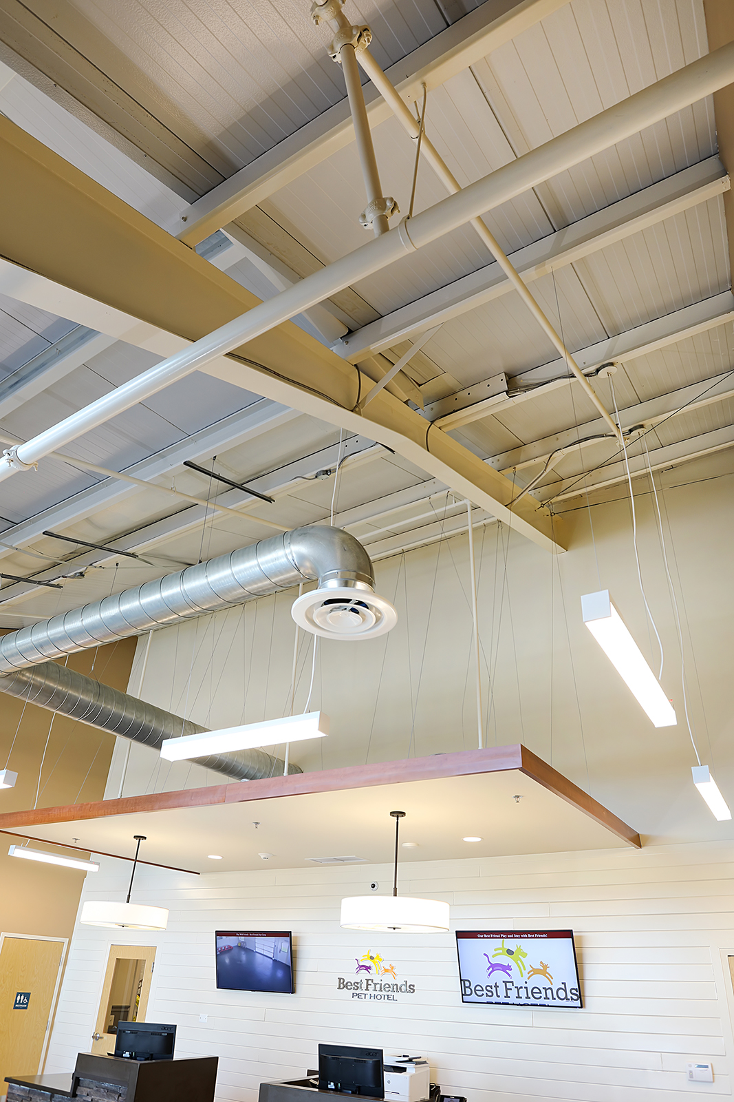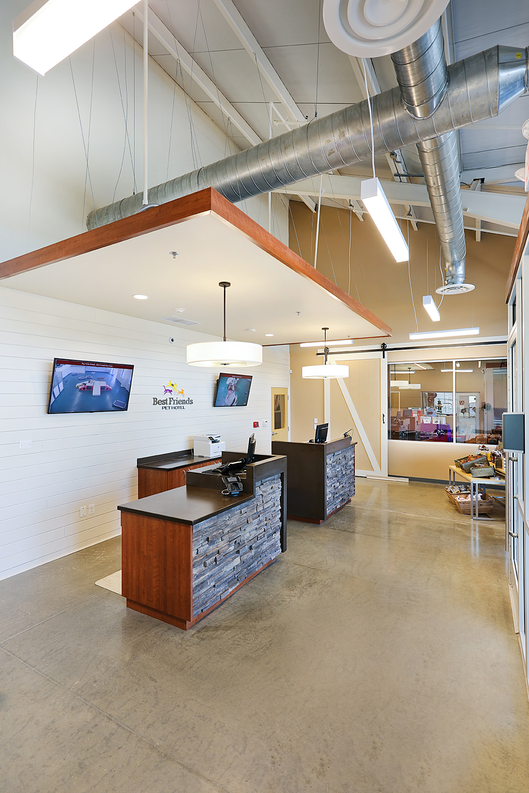 This project is a custom modern design for a National Pet Hotel Brand. The pre-engineered steel building is extremely energy efficient with Fire Resistant building technology to protect our best friends. The structure is a pre-engineered steel system that clear spans the entire width of this 10,400 SF commercial facility. Speed of construction along with a limited budget were key…