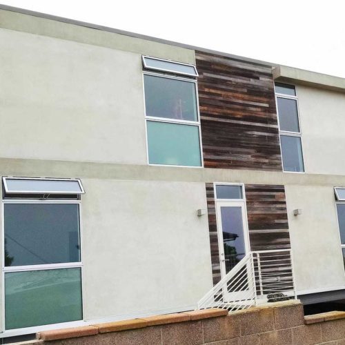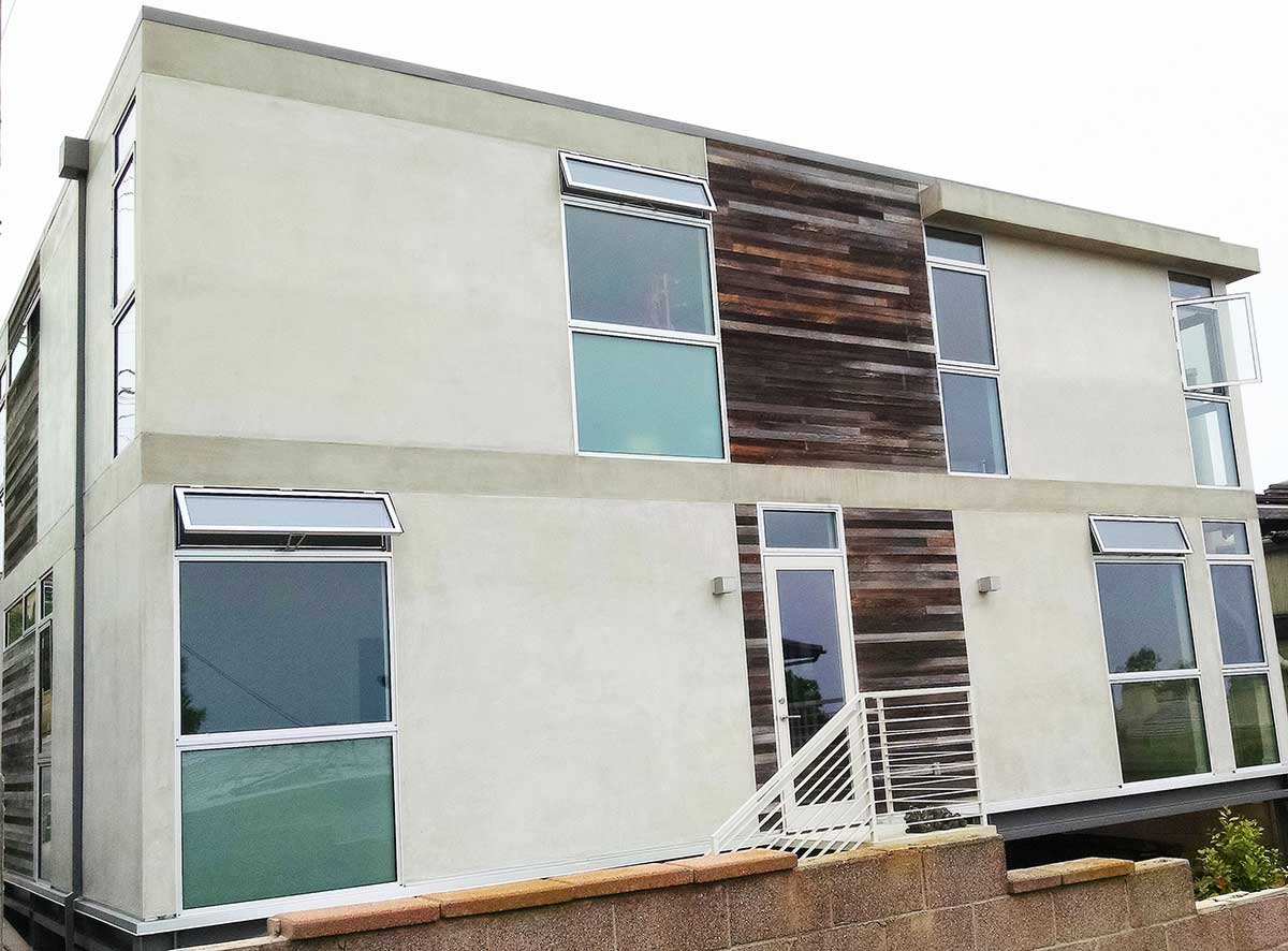 Custom Modern Steel Frame Home by James Meyer Architect (JMA). California Coastal Architecture with a minimalism approach to finish work and design. Fire Resistant Steel Construction for an extensive remodel project, creating a steel frame prefab home in L.A. A modern prefabricated house with commercial grade structure and European style plaster exterior finish with reclaimed wood siding. Wood planks were…