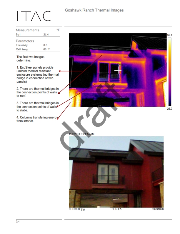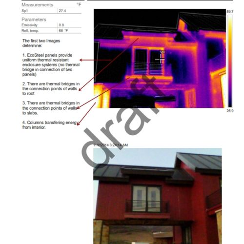 The goal of this study is to assess insulation panel’s thermal behavior and connections performance based on computer-aided simulation tools and high resolution IR thermal camera images of two study projects (Park City, UT and Hampton, NY) once in summer and once in winter. This will demonstrate the success and failures of the thermal envelope and allow Ecosteel to further optimize the energy performance of their buildings to meet Title 24, LEED, Green Globes and other green building standards.”